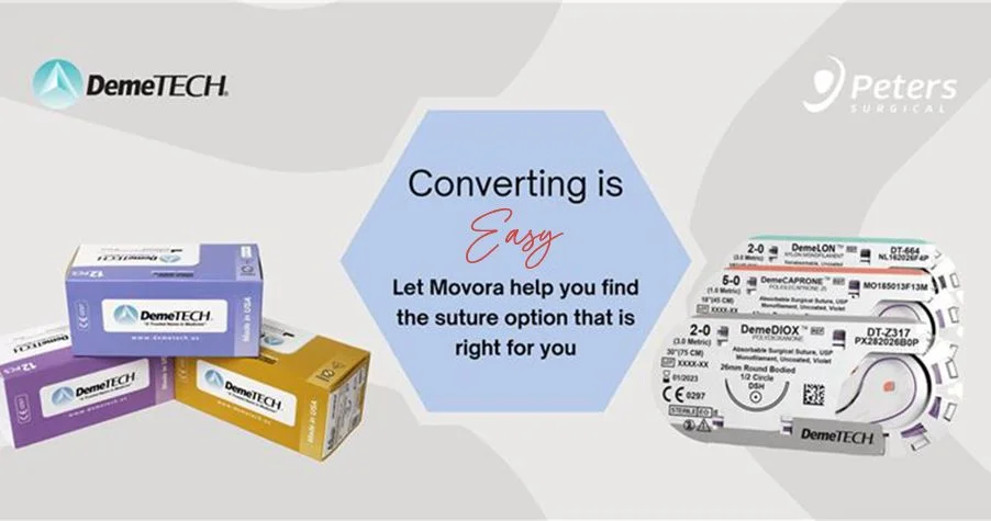 Movora Offers a Full Range of Surgical Suture Options and Assistance with Conversion! Suture is an essential part of every surgical procedure, but with so many products on the market, finding the right fit for your clinic can be challenging. Movora is here to help. Within our diverse portfolio, Movora offers a wide range of suture options to meet every surgical need and budget. Our DemeTECH and Peters Surgical suture lines include trusted materials such as PDS, PGCL, Nylon, Polyester, Polypropylene, and more, giving you reliable choices for all types of procedures. Additionally, when it comes to suture conversion, Movora has the tools to assist, allowing you to easily navigate changing brands and types—our suture conversion charts and representatives are great resources!