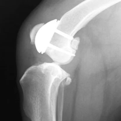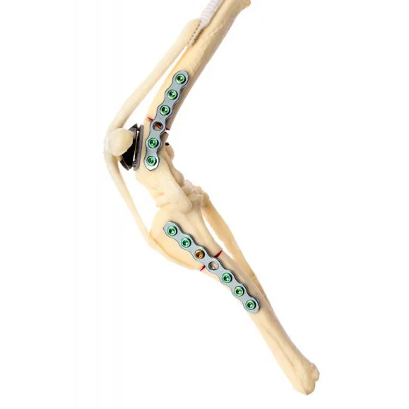 Functional loading of the implant leads to compression of its interface to the bone, which is mechanically favorable to the ill-conditioned load transfer called for by conventional tuberosity transposition, where the full force of the patellar tendon is transferred to the tibia by pins and a figure eight wire.