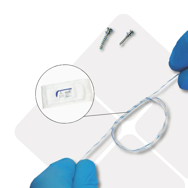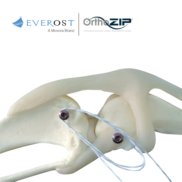 OrthoZip™ uses two titanium alloy bone anchors, placed in isometric locations on the lateral tibia and femur, connected by a self-locking polyethylene suture.