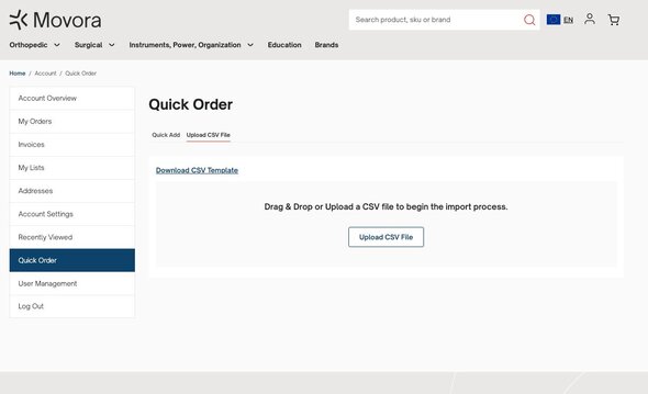 Under Quick Orders you can Search via SKU or Product Name or Upload CSV File. To make the quick orders more efficient we have provided a CSV Movora Quick Order Template that can be downloaded once filled out you can upload the CSV file and begin import.