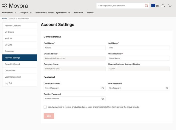 The Customer Account Overview is your Movora Store Account. Under your customer account overview you will find your account overview, orders, invoices, lists, addresses, account settings, recently viewed items, quick order items and control user management.